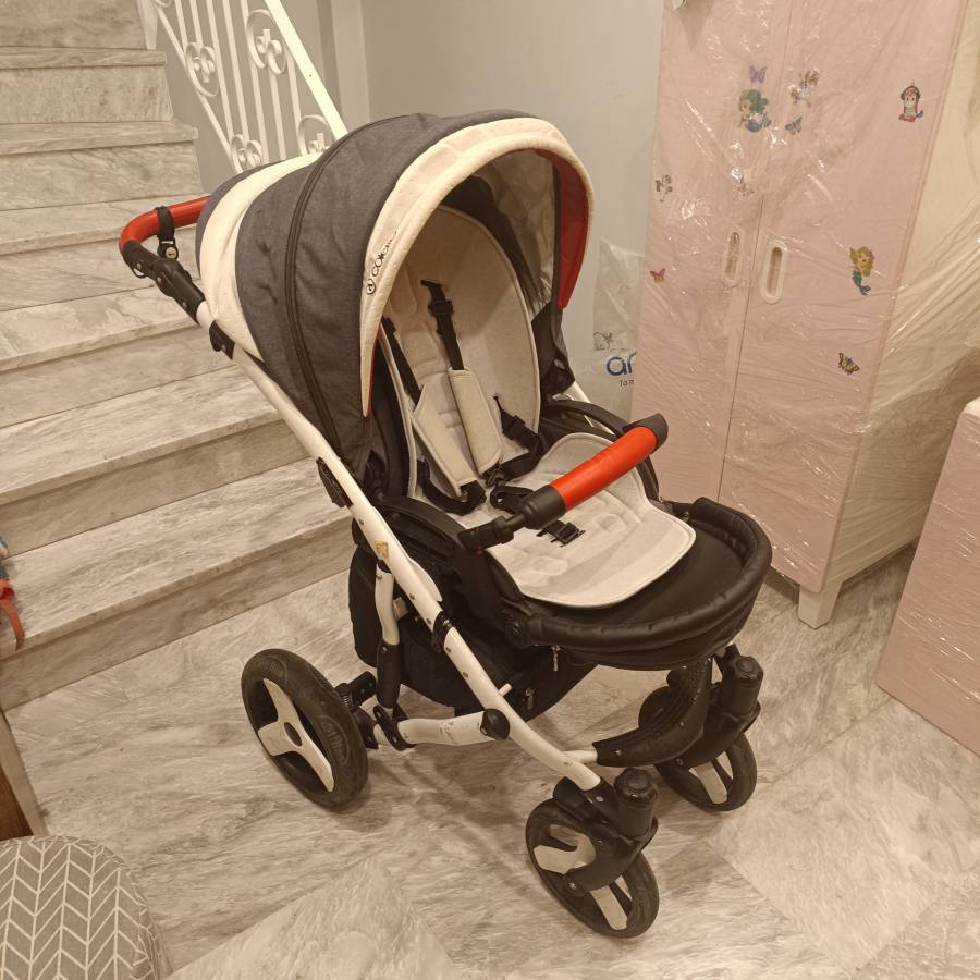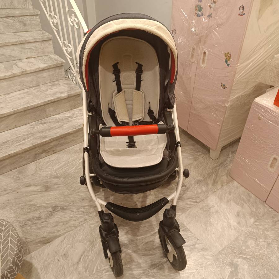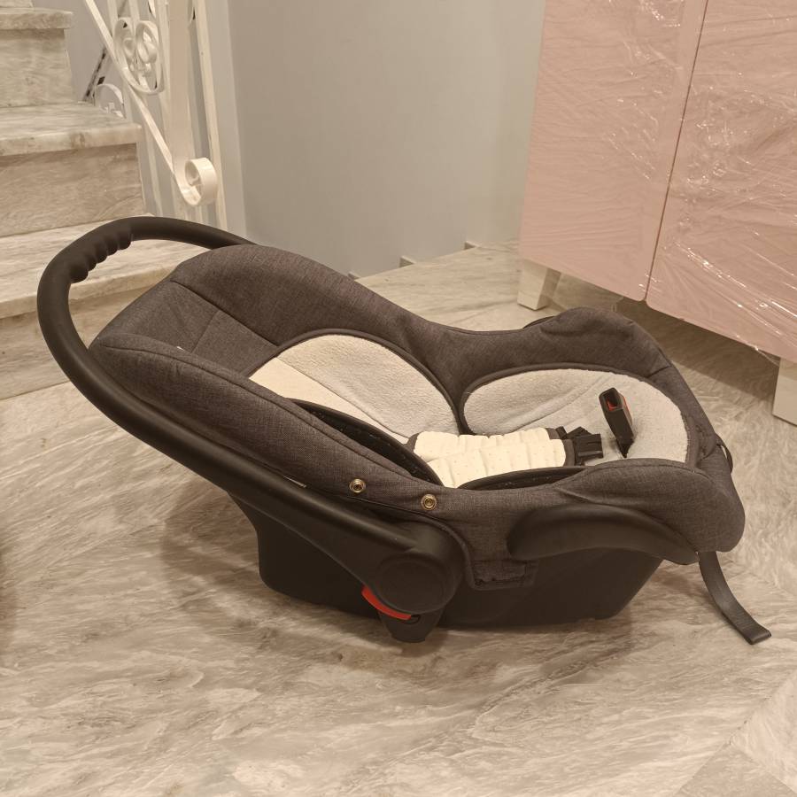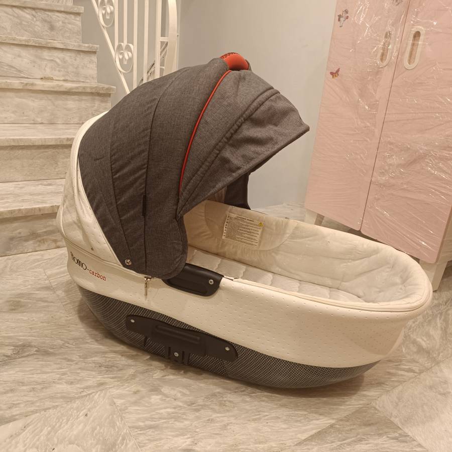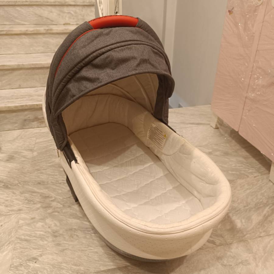 Περιλαμβάνεται port bebe με βάση ανθρακονήματα και στρώματακι με κοκοφοίνικα, καθισματάκι αυτοκινήτου και το κάθισμα βόλτας. Και για τα 3 είδη μεταφοράς περιλαμβάνονται τα καλύμματά τους, κουνουπιέρα και κάλλυμα για βροχή. Είναι σε άριστη κατάσταση.